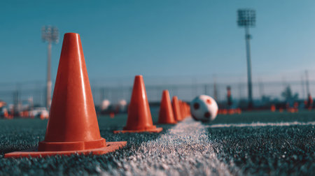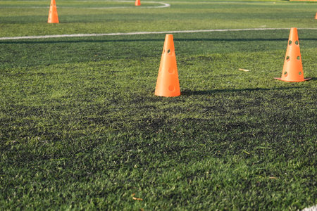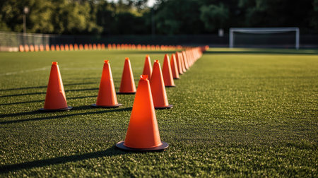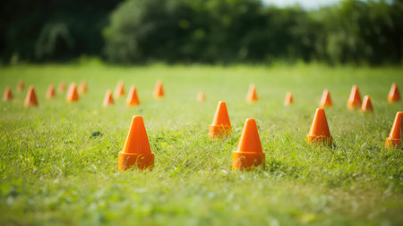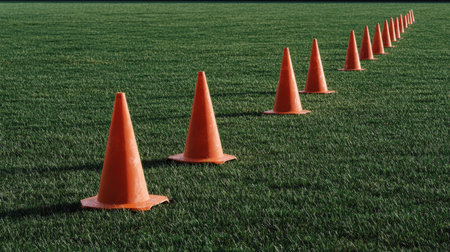 A series of vibrant orange traffic cones neatly arranged on a sports field, creating a clear path for training drills, enhancing focus and agility.