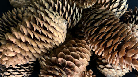 Fir cones fallen from trees. Brown dry buds are scattered on a black table