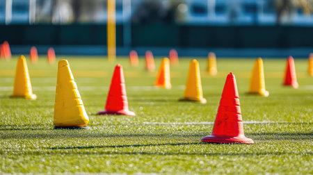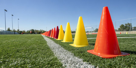 Vibrant red and yellow training cones are arranged neatly along the edge of a green sports field on a sunny day. The clear blue sky enhances the energetic atmosphere of the session.