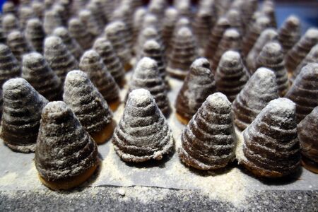 Profile view of aroma incense cones standing side by side and isolated on white background with selective focus.