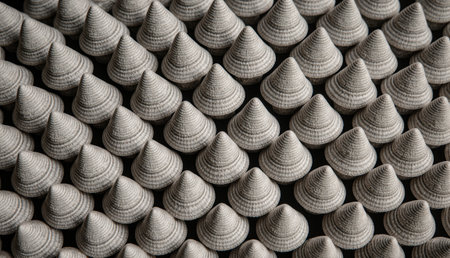 Conical sculptures arranged in precise rows form a captivating texture. The interplay of light and shadow highlights the details, creating an engaging view within a contemporary space.