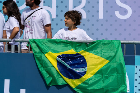 Fans cheer on their favorite players as Team Brazil (BRA) plays Team Japan (JPN) in the Preliminary Phase - Pool E Women's Beach Volleyball at the Stade Tour Eiffel stadium during the Paris Olympics 2024 in Paris, France.