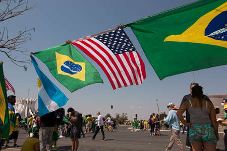Lifting Brazilian Flags: Back view group of People Holding Brazilian Flags,