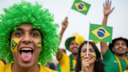 A group of enthusiastic Brazilian football fans are seen celebrating, with some wearing face paint and holding Brazilian flags.