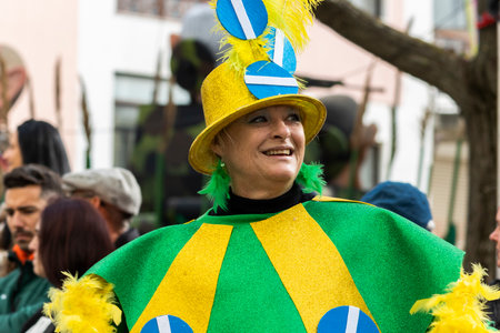 LOULE, PORTUGAL - 17th FEB 2024: Colorful Carnival (Carnaval) Parade festival participants on Loule city, Portugal.