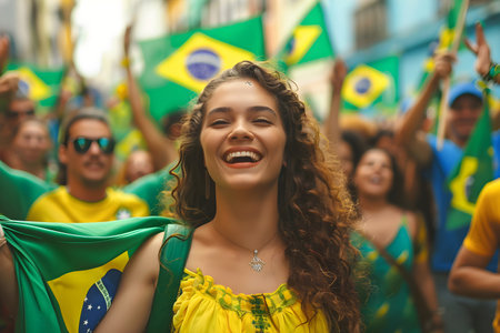 Celebrating Brazil's Independence Day. Joyful people with flags and symbols of Brazil.