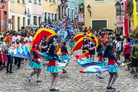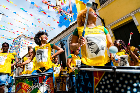 Salvador, Bahia, Brazil - June 22, 2018: Members of the percussion band Dida are seen during a performance in Pelourinho. City of Salvador, Bahia.