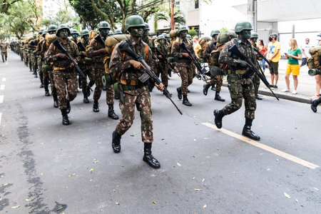 Salvador, Bahia, Brazil - September 07, 2022: Soldiers of the Brazilian army march with special weapons and camouflage at the independence parade in Salvador, Bahia.