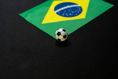 Small football on the white floor and Brazilian nation flag with the text of Brazil background. The concept of sport.