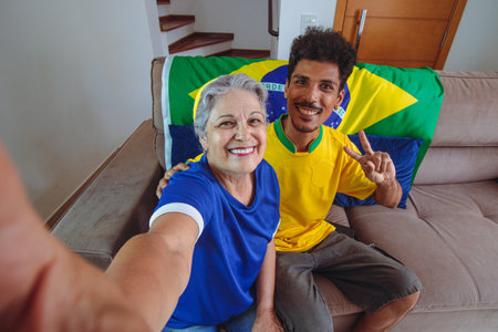 Mother and Son Celebrating the Cup in the living room watching TV cheering for Brazil. Mixed Race Family taking selfie photo while watching cup game.