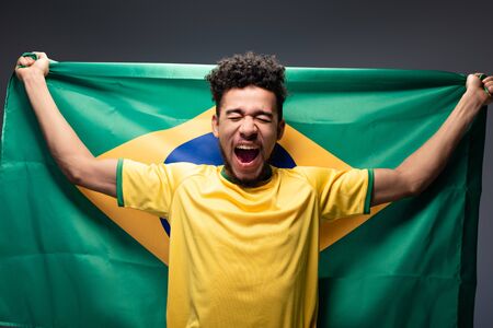Image of african american male soccer player over flag of brazil. Global patriotism, celebration, sport and digital interface concept digitally generated image.