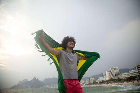 Smiling young man holding up Brazilian flag on Ipanema beach, Rio De Janeiro, Brazil