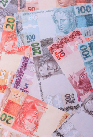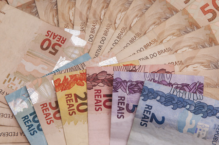 Real currency (BRL) - Money from Brazil. Money, Reais, Brazilian Real, Brazil. Brazilian banknotes in close up on a desk.