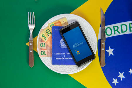 Florianopolis, Brazil. June 27, 2020: Money and Cell Phone with the image of the Emergency Aid plan Brazilian dish of food. Concept of social aid to the neediest. Background Brazilian flag.