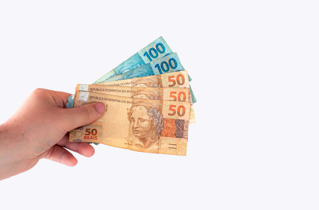 Hand holding Brazil's official money. Brazilian Real banknotes