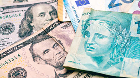 A background consisting of paper banknotes of different currencies of the USA, Europe, Brazil. Multicurrency background