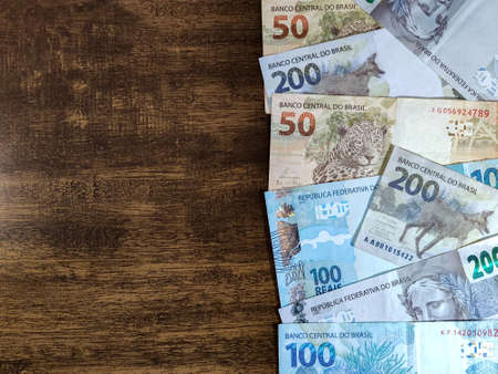 various money notes of 50 reais 100 reais and 200 reais from brazil on a wood background. space for text. money from brazil. earn money. Real, Currency, Money, Cash, Reais