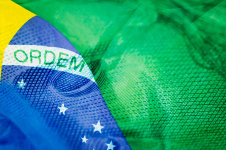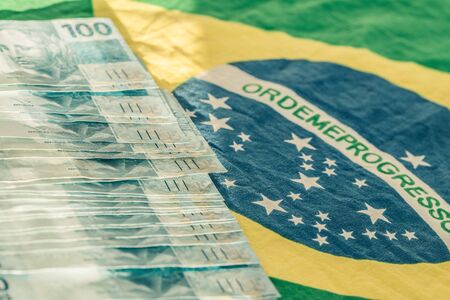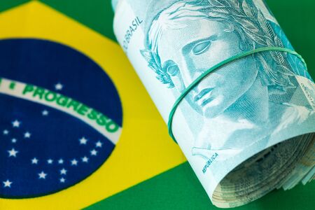 Brazilian money banknotes with Brazilian flag in the background.