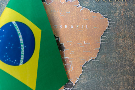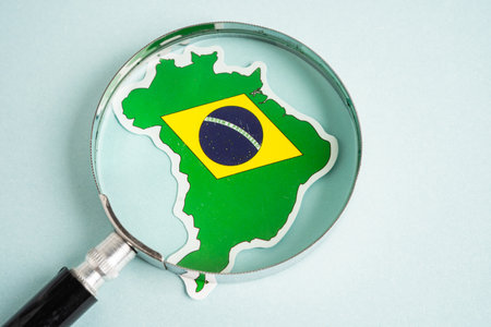 Brazil flag and magnifying glass with copy space.