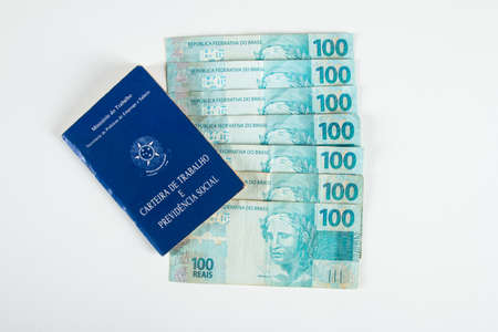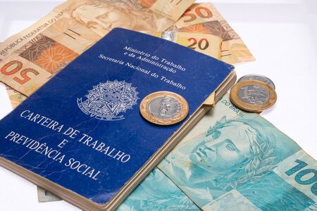 Brazilian document work and social security (Carteira de Trabalho e Previdencia Social) with Brazilian money banknotes.