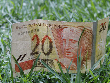 approach to brazilian banknote of twenty reais on green grass