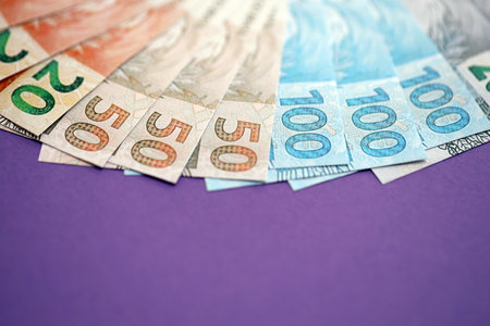 Close up of brazilian reais money bills in big amount on purple table. Pile of Brazil real currency banknotes. Finance and banking concept