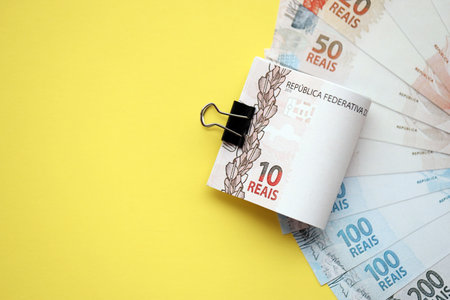 Close up of brazilian reais money bills in big amount on yellow table. Pile of Brazil real currency banknotes. Finance and banking concept
