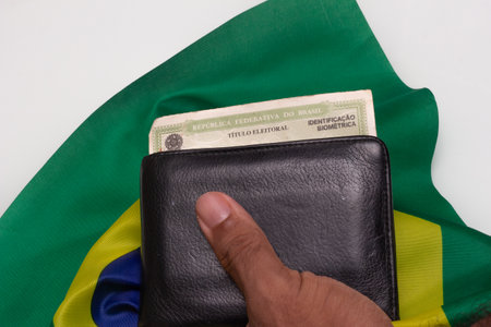 LAURO DE FREITAS, BRASIL - JULY 21, 2022 : man holding on a wallet with a brazilian elector's title under the brazilian flag