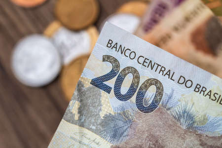 Money, Brazil, Real, Reais. Real currency, money from Brazil. Brazilian banknotes in close-up. Banknote of 200 reais (two hundred - two hundred reais) and 50 reais.