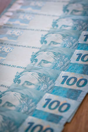 Brazilian money, one hundred Reais banknotes spread out on the table in a fan