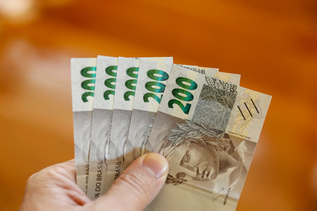 image of hand holding open 200 reais bills, highlighting details, security features, and design of Brazilian currency