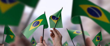 Lifting Brazilian Flags: Back view group of People Holding Brazilian Flags,