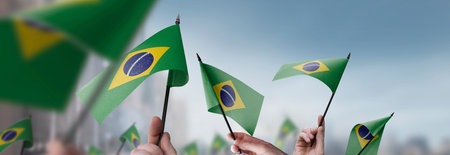 Hand holding Brazil national flag on blue sky. Happy Independence Day, Labor Day