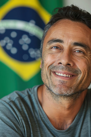 A Brazilian fan smiles warmly with a sunlit flag draped behind, capturing cinematic optimism and tropical light tones. The image exudes a sense of joy and national pride.