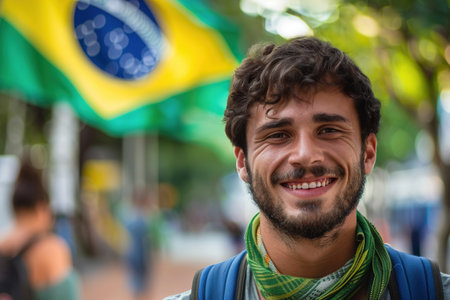 Happy, smiling man stands in front of a blurred Brazilian flag, symbolizing patriotism and national pride. Brazilian Independence Day. Love for the country. National holiday in Brazil. Generative AI.
