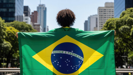 A person stands with the Brazilian flag draped over their shoulders, showcasing national pride in an urban environment.