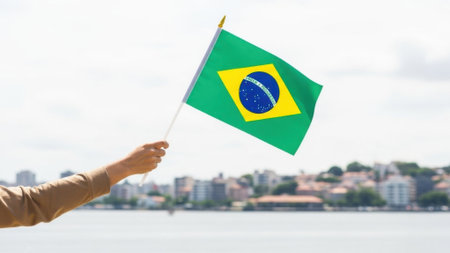 A hand holds the Brazilian flag, with a city and sky in the background, representing patriotism.