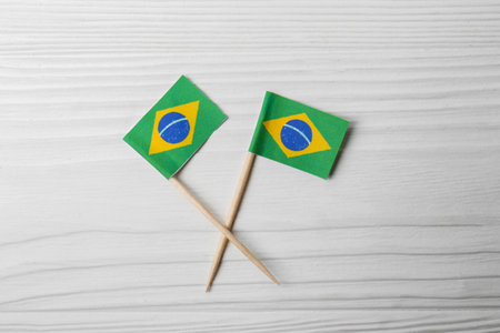 A persons hand holds two small flags of Brazil against a blurred backdrop of buildings and water.