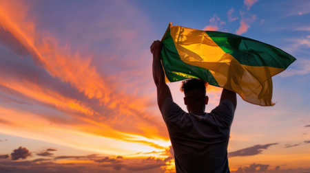 A man stands with his back to the camera, proudly holding the Brazilian flag high against a stunning sunset backdrop. Vibrant clouds reflect warm hues, enhancing the connection to culture and patriotism.