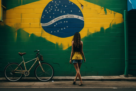 Proud Brazilian Girl Roaming the Streets with the National Flag --ar 3:2
