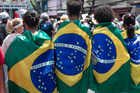 Salvador, Bahia, Brazil - October 22, 2022: Supporters of the President of Brazil Jair Bolsonaro, protest by placing a large Brazilian flag in Farol da Barra square in Salvador.