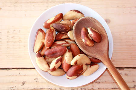 Brazilian nut, known as Castanha do Pará in wooden spoon on rustic wooden background