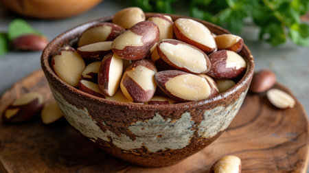 Ceramic Bowl of Brazil Nuts on Rustic Table.