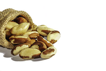Brazil nuts scattered from burlap bag isolated on white background. Copy space....