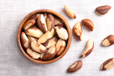 Brazil nuts in a wooden bowl on linen fabric. Dried seeds of Bertholletia excelsa without shells. Brazil nuts, notable for diverse content of micronutrients.