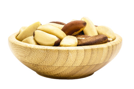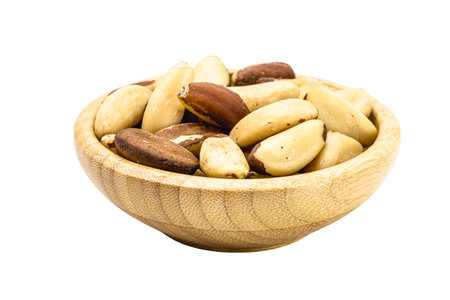 Brazil nuts in a wooden bowl on a white background.