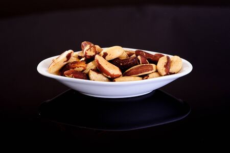 Brazil Nuts in a white plate on a black background