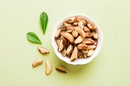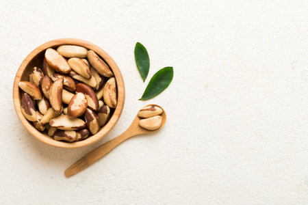 Fresh healthy Brazil nuts in bowl on colored table background. Top view Healthy eating bertholletia concept. super foods.