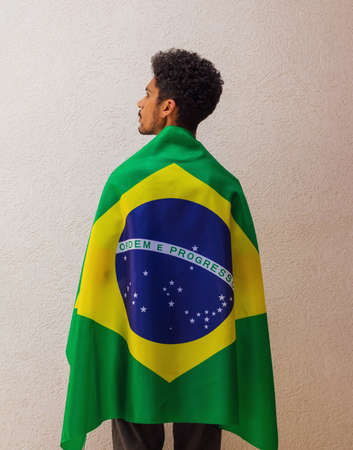 Brazilian Soccer Player Celebrating on a White Background. Dramatic Portrait of a Black Soccer Player Holding Flag.