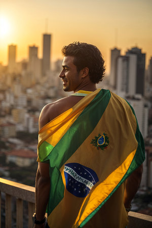 Man Celebrating Brazil Independence Day Next in Country Flag, Cinematic Sunset City Background